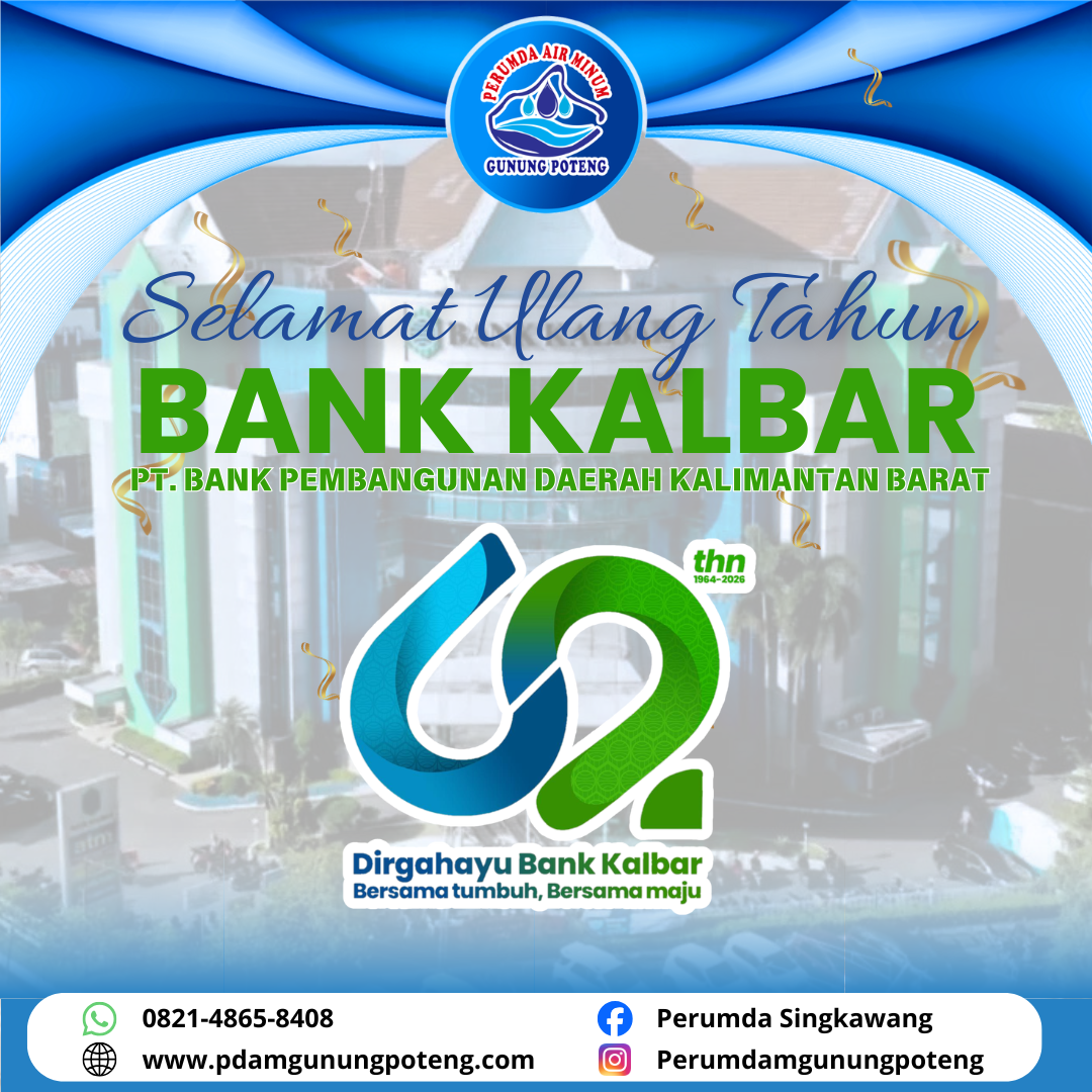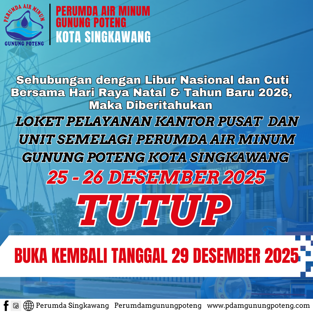 Selamat datang di website PERUMDA Air Minum Gunung Poteng Kota Singkawang. Kami akan berusaha memelihara & meningkatkan semangat kerja, untuk mewujudkan air mengalir terus sampai jauh ke rumah-rumah masyarakat Kota Singkawang.