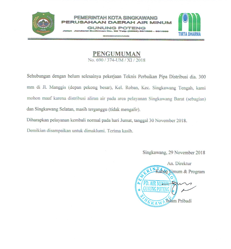 Pengumuman. Dikarenakan terjadinya kerusakan pipa dia. 300 mm di Jl. Manggis yang mengakibatkan pelayanan air terganggu.