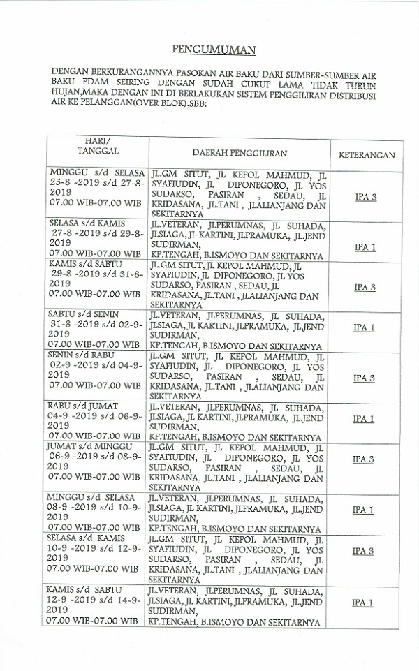 Pengumuman. Pihak PDAM akan berupaya untuk segera menyelesaikan pekerjaan perbaikan pipa agar pelayanan distribusi air bisa segera dilanjutkan. Mohon maaf dan harap dimaklumi.
